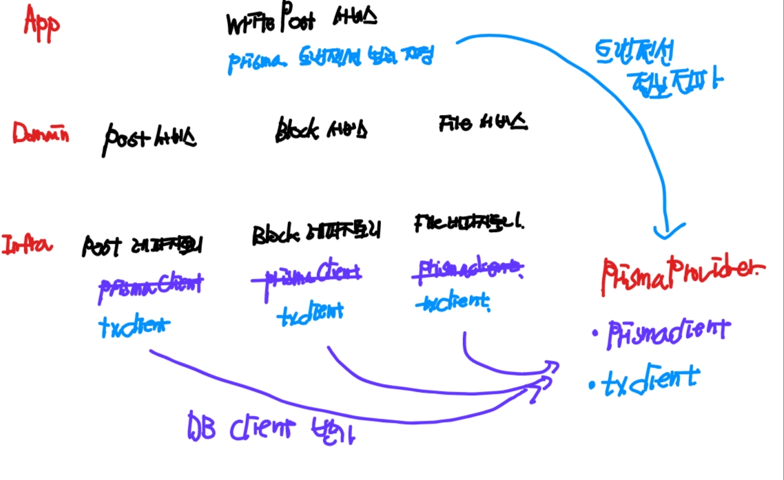 - Repository들은 PrismaProvider에 접근해 txClient 혹은 PrismaClient를 받습니다.